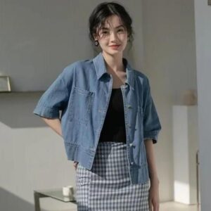 Women's Vintage Cropped Denim Shirt - Summer Chic Short Sleeve Top