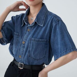 Summer Denim Blouse for Women: Casual Short Sleeve Button-Up Shirt
