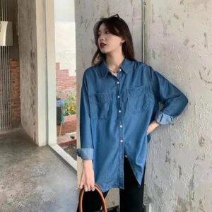 Fashion Polo Collar Denim Blouses - 2023 Spring Casual Long Sleeves Jean Shirt