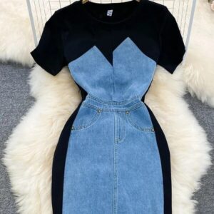 Embrace the seamless blend of casual sophistication and contemporary fashion with our Chic Denim Splice A-Line Dress. Perfectly suited for the modern woman, this dress is a staple for any season, offering versatility and style in one. The simplicity of the design, complemented by the innovative denim splice, creates an illusion of a two-piece ensemble that will keep heads turning whether you’re at a brunch or an office event. Its round neck and short sleeve combo present a flawless canvas for accessorizing or keeping it stunningly minimalist.