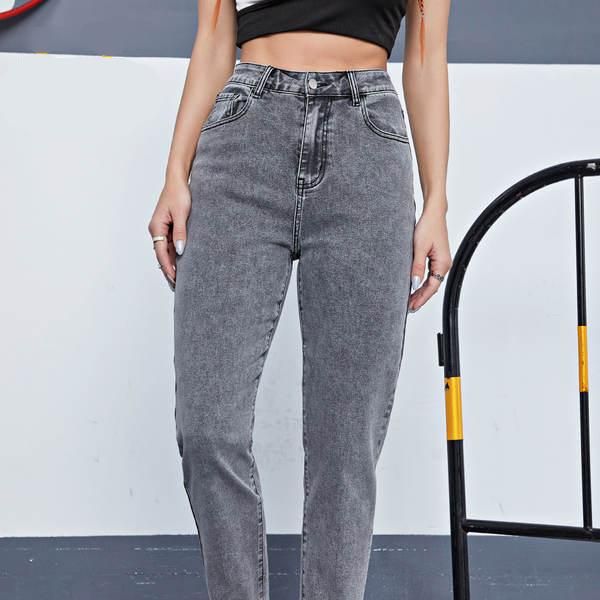 Chic Gray High-Waist Straight Leg Jeans – Women’s Casual Vintage Full-Length Denim