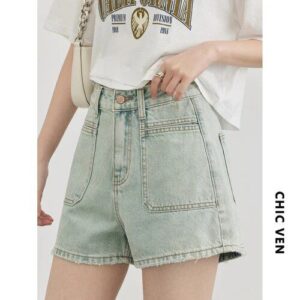 Every pair of our denim shorts boasts a high-waist fit that flatters your midsection, alongside an A-line cut that offers a relaxed feel without compromising on style. The light wash and stylish pockets add a touch of retro sophistication, while the drawstring closure ensures a perfect fit for all-day comfort. Our commitment to quality is evident in the premium cotton denim fabric, promising durability and breathability during those hot summer months.