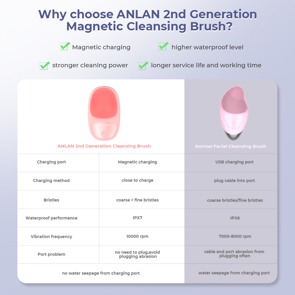 Our facial cleansing brush stands out with its magnetic charging feature, offering convenience and safety. The high-speed vibration provides a deeper clean compared to manual washing, ensuring your skin is free from impurities. The IPX7 waterproof rating means you can use it confidently in wet environments, and the timer function ensures you never over-clean your skin.